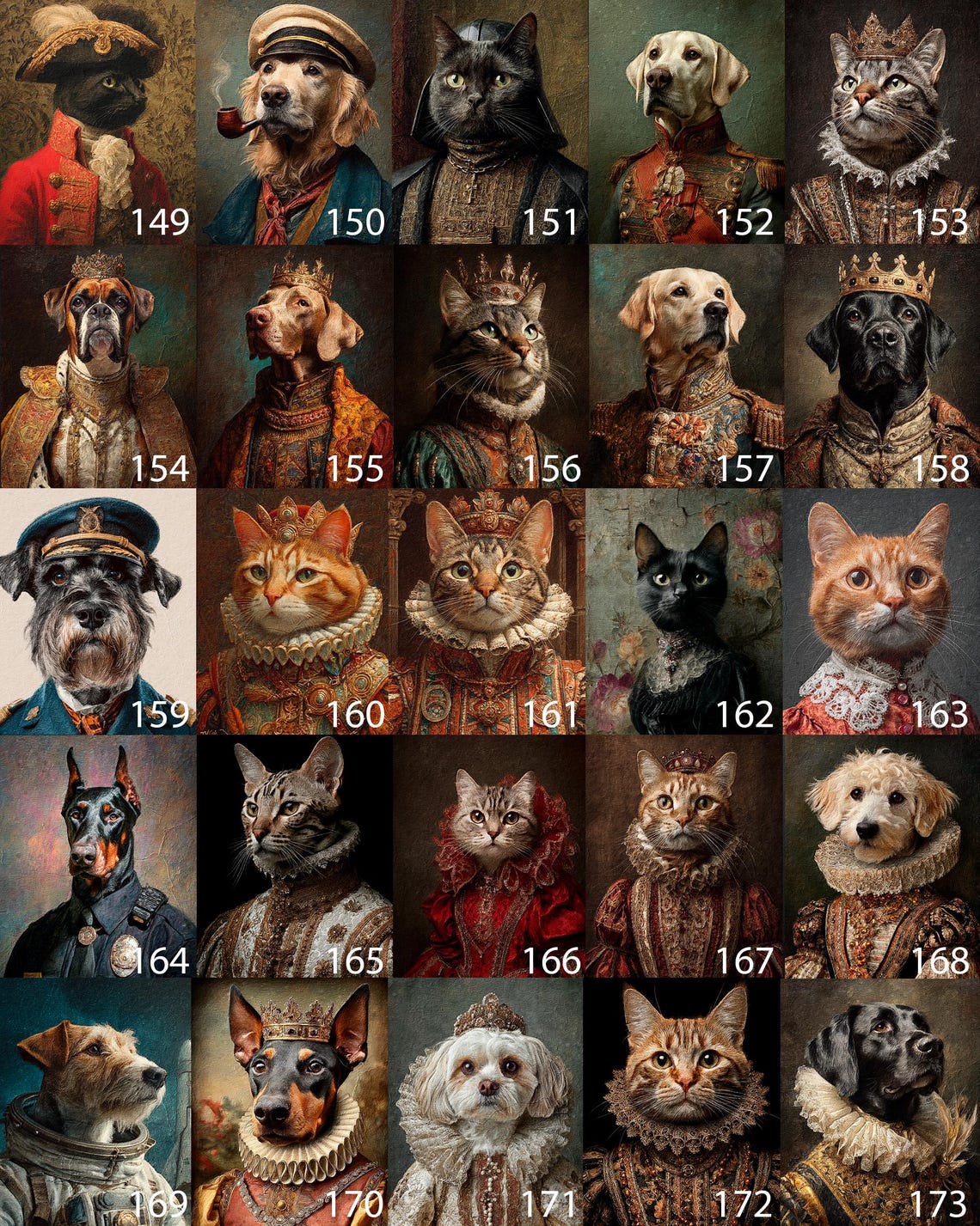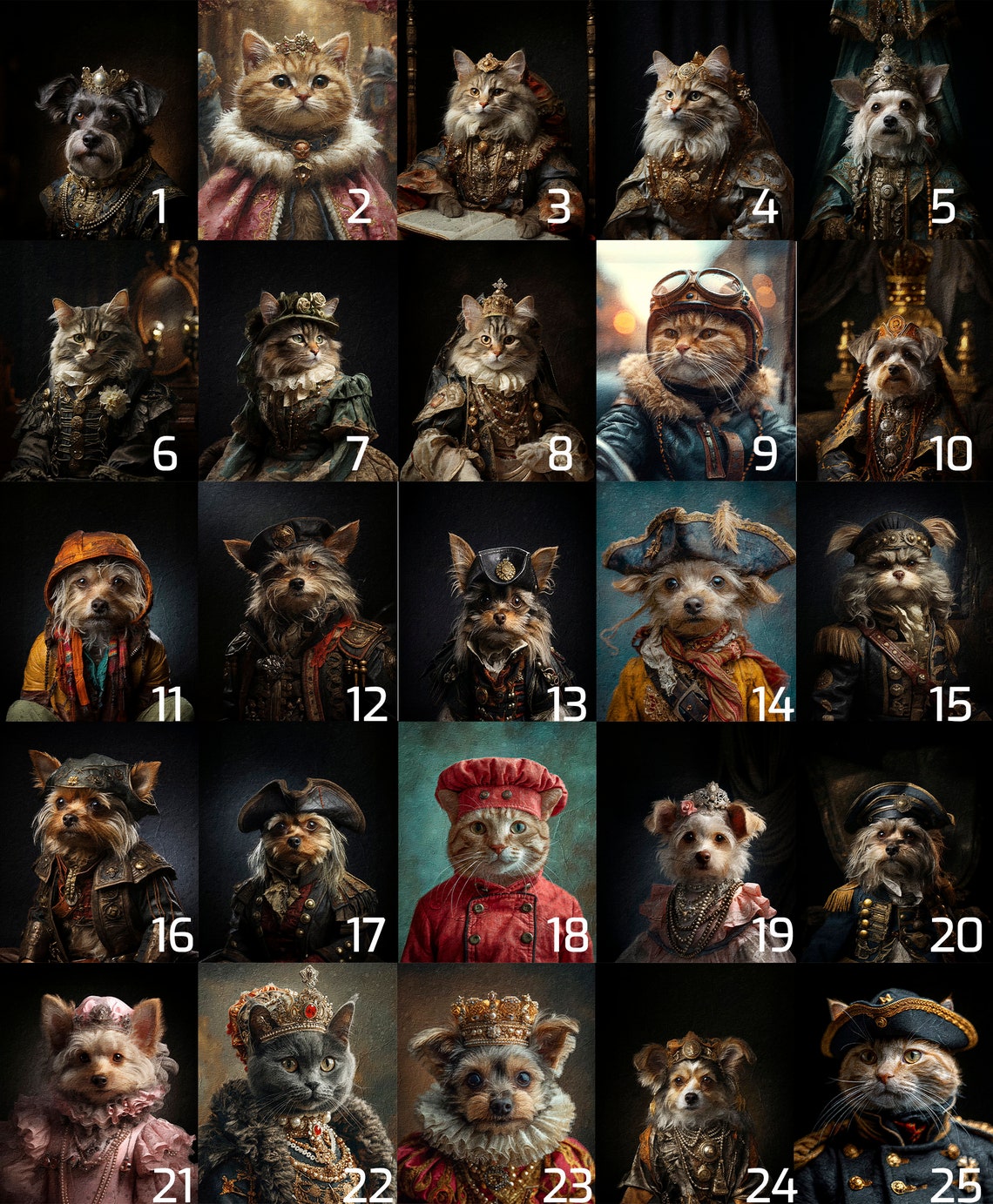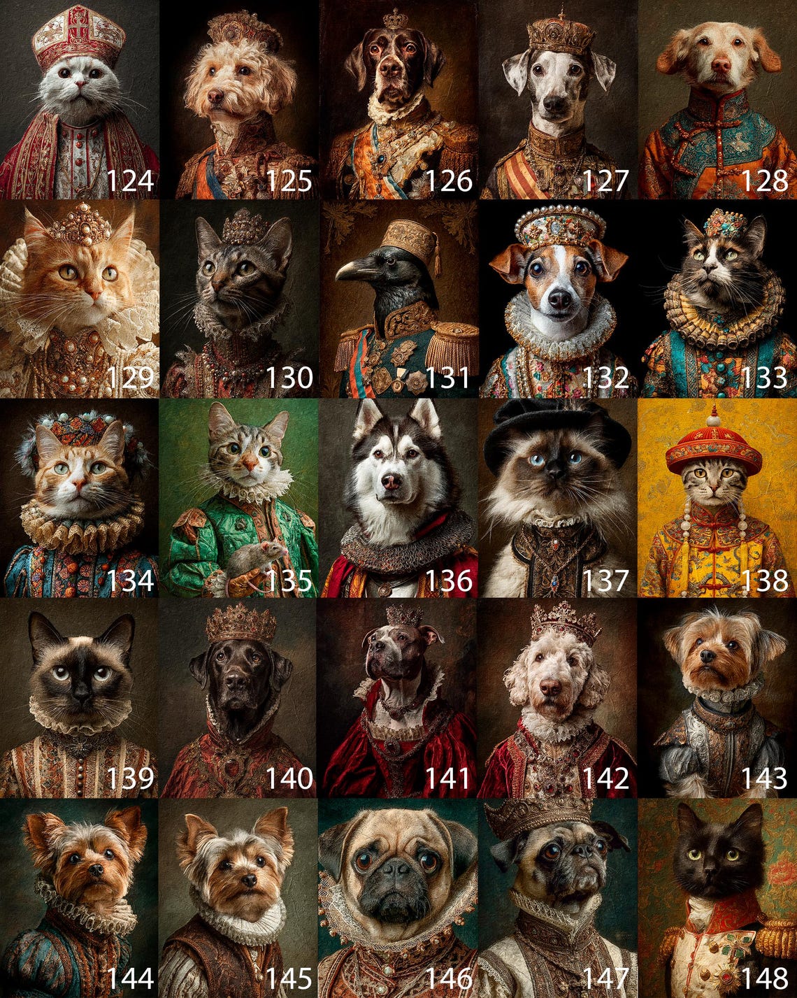 Šie portretai puikiai tinka pagerbti mylimų augintinių atminimą. Įtraukdami savo personalizacijas, galite papuošti bet kurį namų kambarį arba padovanoti artimiesiems portretą, kuriame jūsų augintinis paverčiamas karališkosios šeimos nariu.